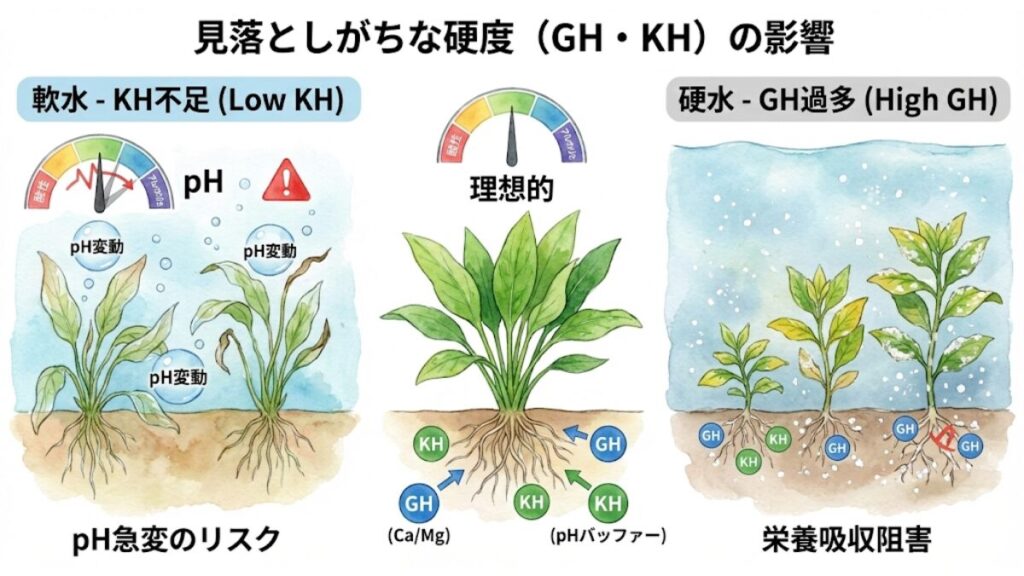 軟水地域にお住まいの方は、KHが低すぎてpHが急激に変動しやすく、逆に硬水地域の方はGHが高すぎて特定の栄養素が吸収されにくくなることがあります。この硬度バランスを理解せずに水草を育てようとすると、思うような成長が期待できません。